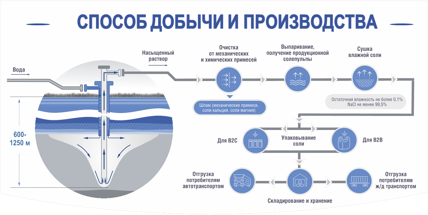 Добыча соли осуществляется 10 (десятью) скважинами рассолопромысла, находящегося на расстоянии 3-х километров от основной промышленной площадки предприятия. Через специальное устройство в скважину подается вода, растворяющая в себе соль в месте залегания до максимальной концентрации, а насыщенный раствор, именуемый рассолом, поднимается на поверхность и посредством рассолопроводов перекачивается на основную площадку.