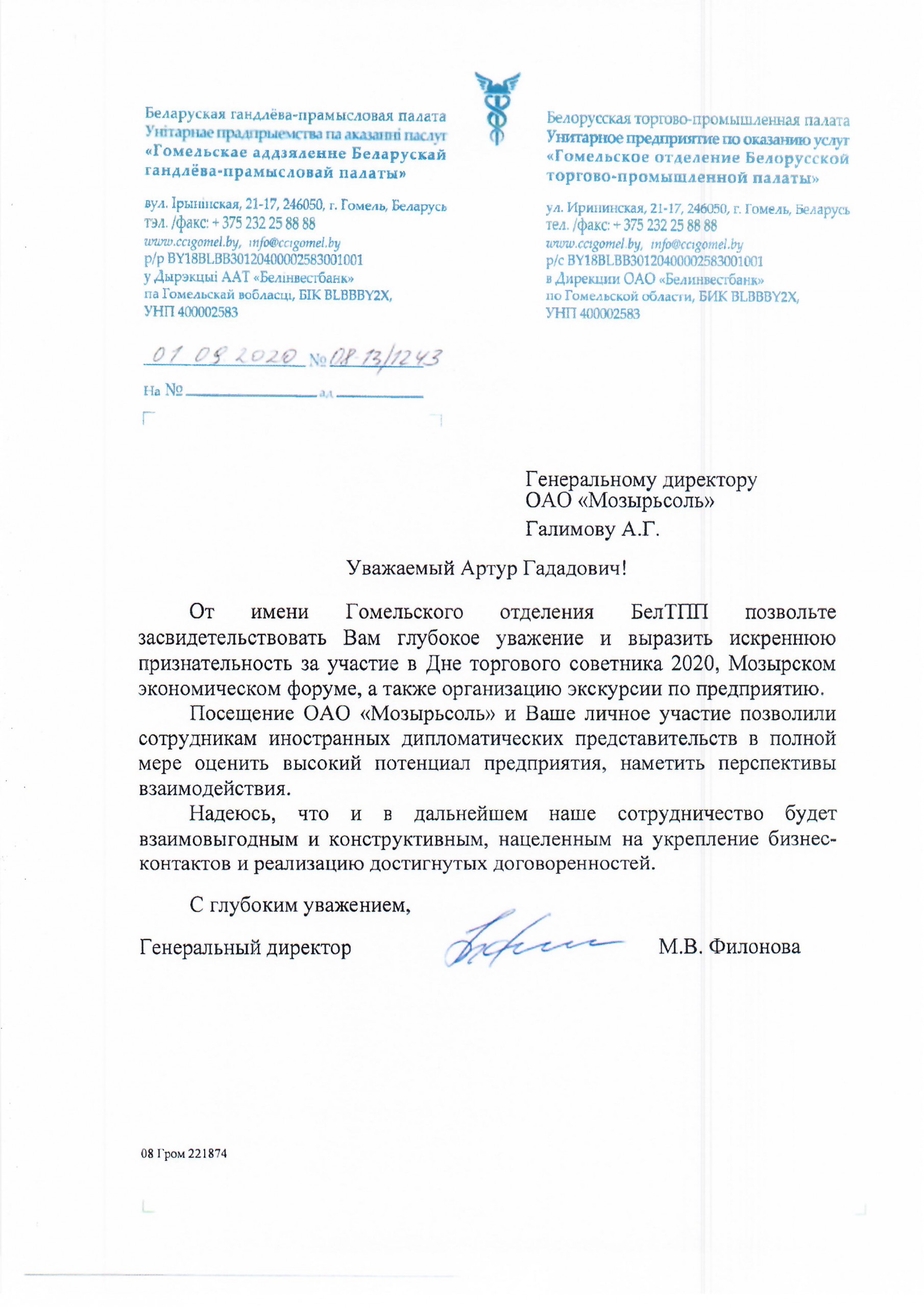 От имени Гомельского отделения БелТПП позвольте засвидетельствовать Вам глубокое уважение и выразить искреннюю признательность за участие в Дне торгового советника 2020, Мозырском экономическом форуме, а также за организацию экскурсии по предприятию.