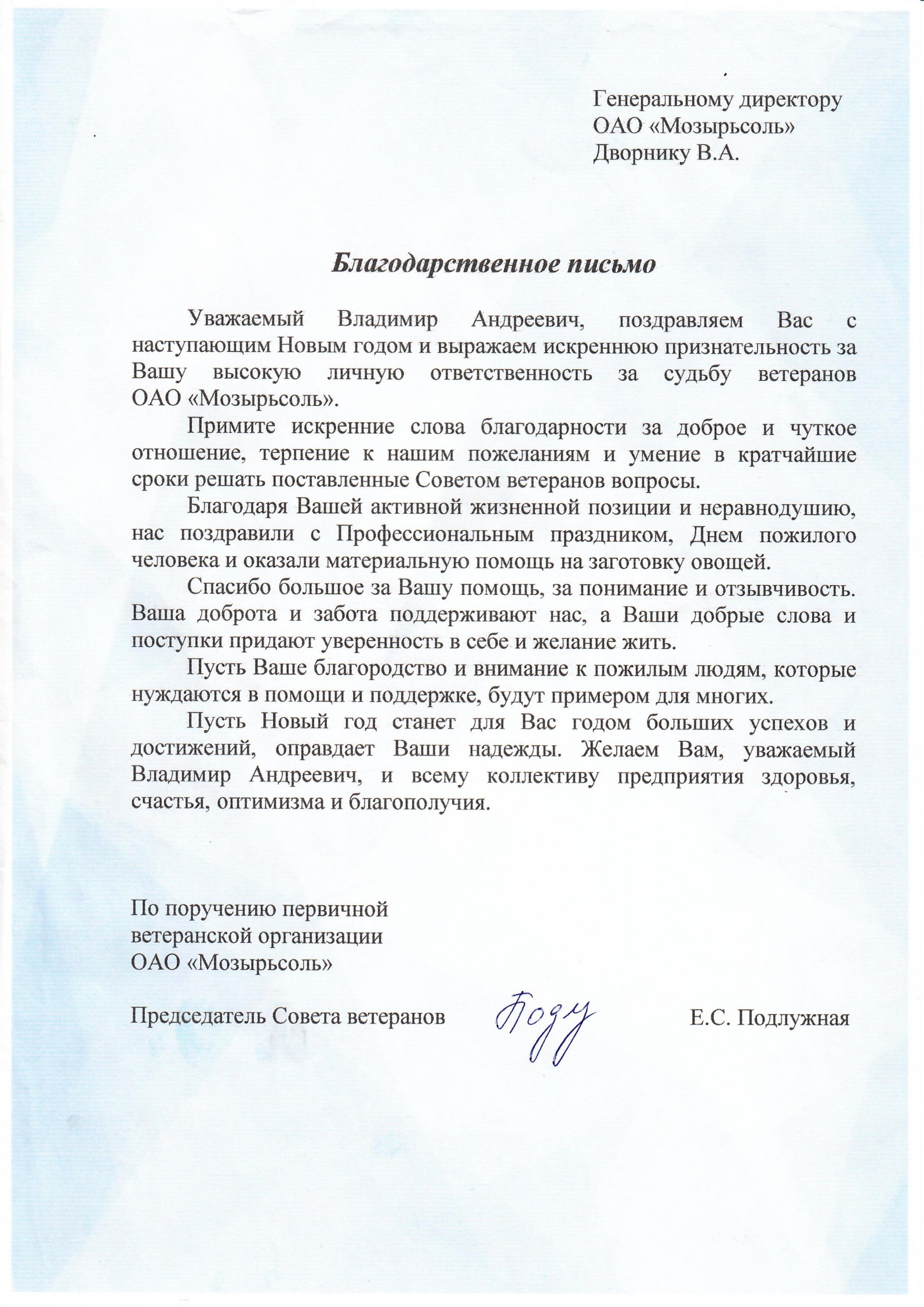 Уважаемый Владимир Андреевич, поздравляем Вас с наступающим Новым годом и выражаем искреннюю признательность за Вашу высокую личную ответственность за судьбу ветеранов ОАО «Мозырьсоль».