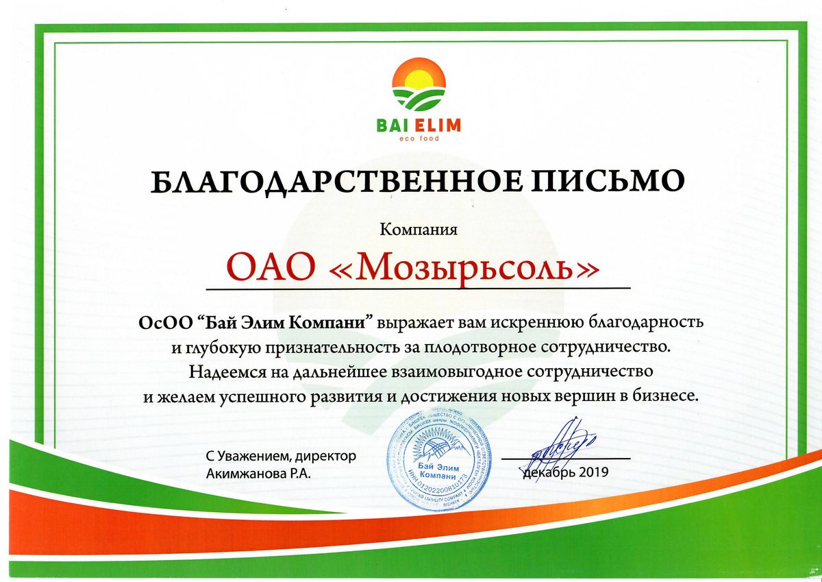 ОсОО «Бай Элим Компани» выражает вам искреннюю благодарность и глубокую признательность за плодотворное сотрудничество.