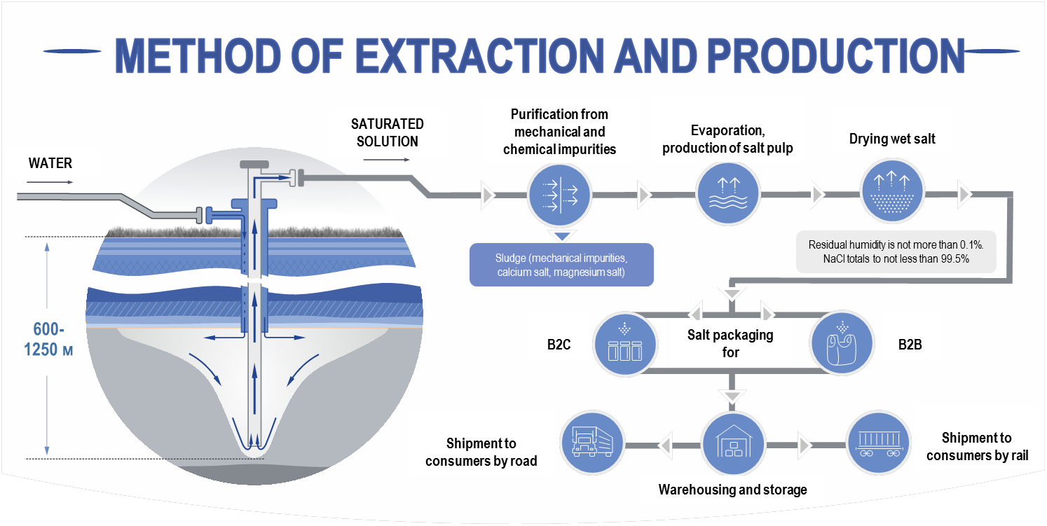 Salt production is carried out in ten (10) wells of the brine field, located at a distance of 3 kilometres from the main industrial site of the enterprise. With a special device, water is introduced into the well, dissolving the salt in itself at the bed to the maximum concentration, and the saturated solution, called the brine, rises to the surface and is pumped to the main site using brine pipelines.