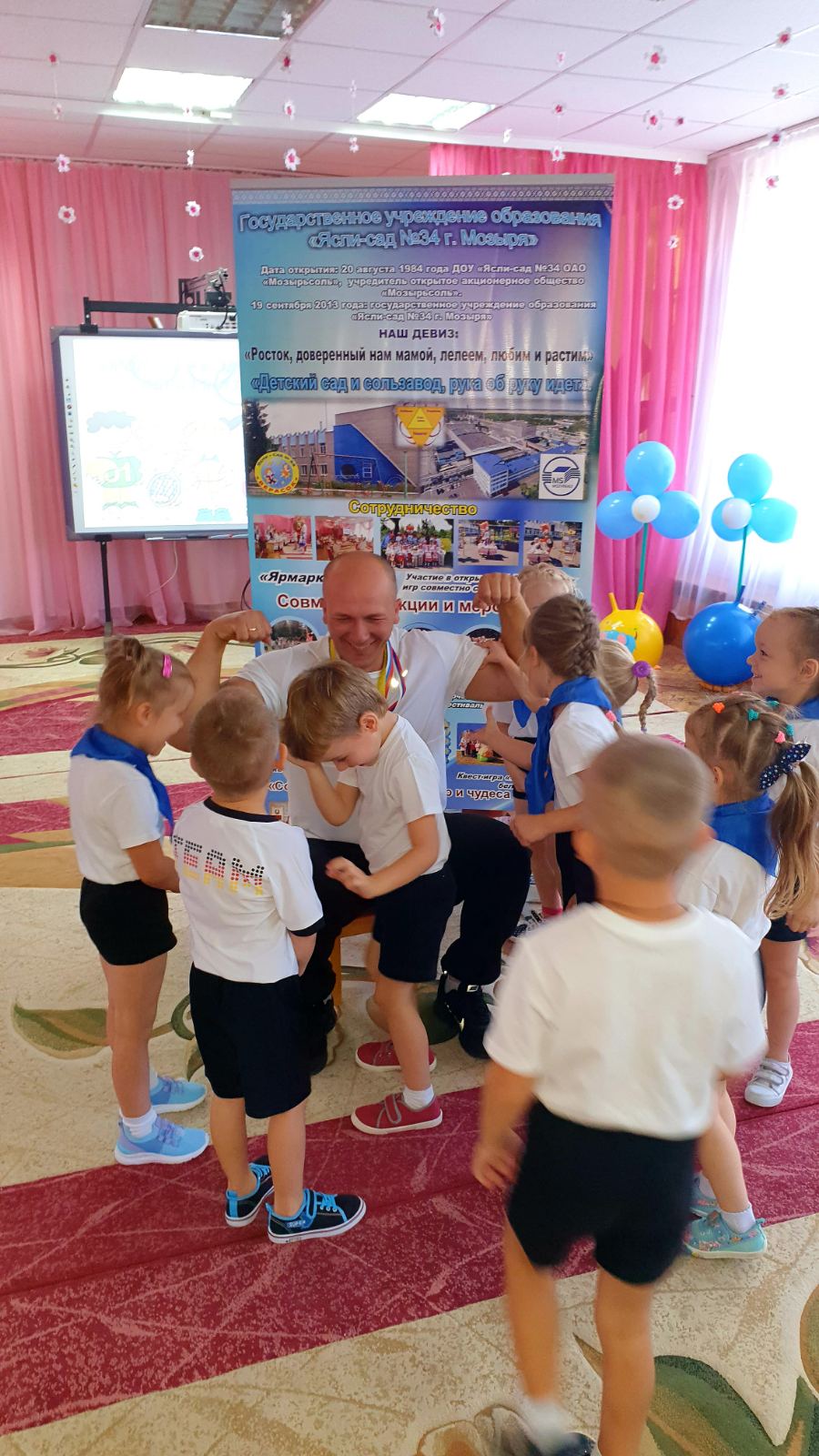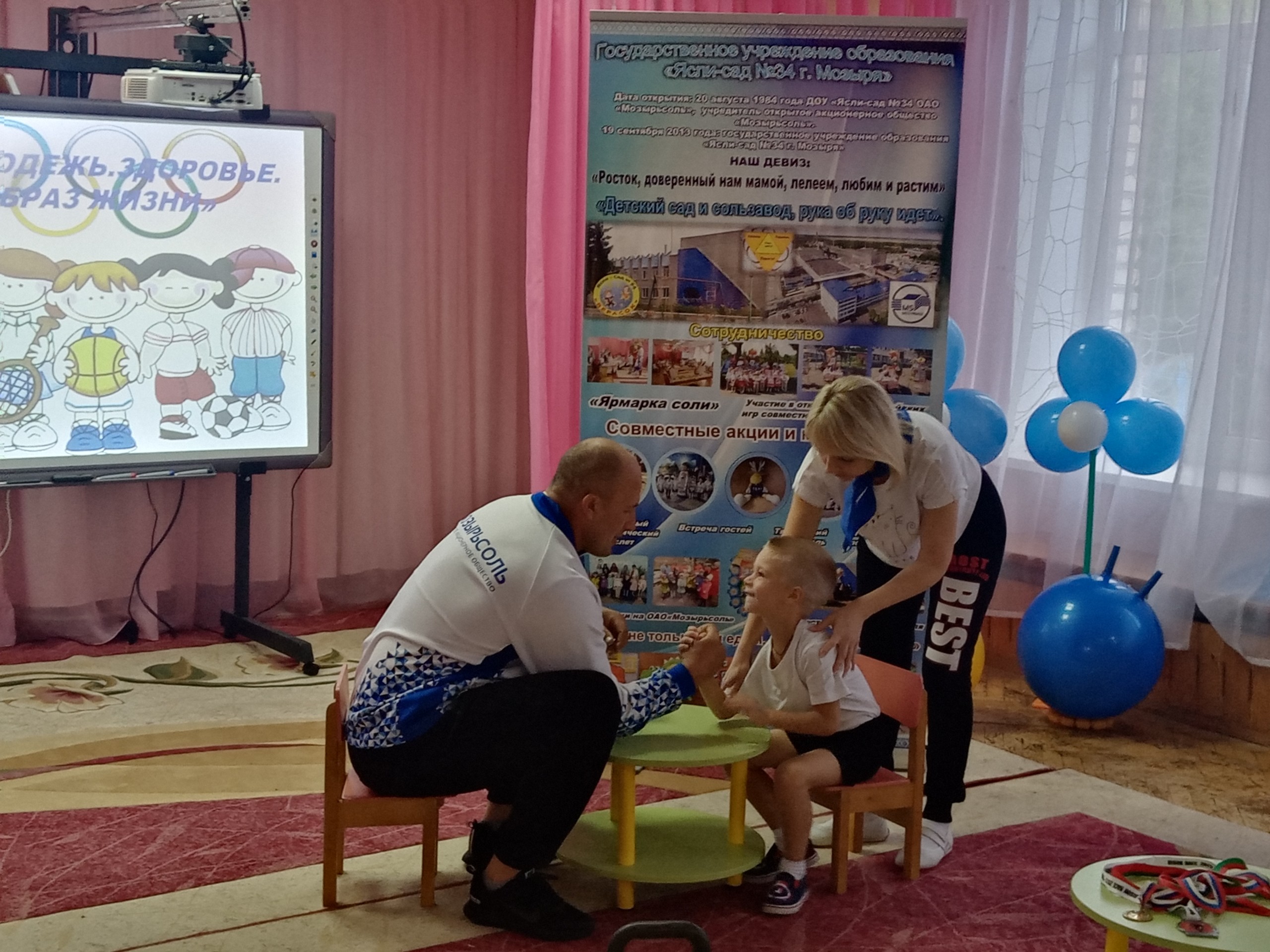 Воспитанники подшефного детского сада не только активно двигались и принимали участие в состязаниях (разминка с чемпионом, перетягивание каната, мерялись силами в армрестлинге) с чемпионом Европы по гиревому спорту и чемпионом г. Мозыря по армрестлингу грузчиком транспортного цеха Ситником Сергеем Сергеевичем, но и увидели мастер-класс по подъёму гири в 16 кг, закрепили представления о здоровом образе жизни, правилах безопасности при занятии спортом.