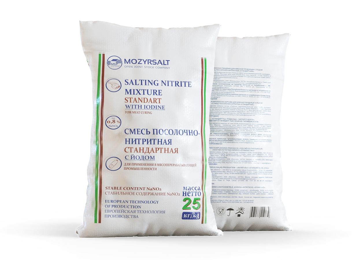 СпецификацияКомплексная пищевая добавка для мясной продукции «Смесь посолочно-нитритная «Стандартная» с йодом (ПНС) произведена по технологическим регламентам ТР ТС 029/2012 и ТР ТС 021/2011 и соответствует всем требованиям ТУ РБ 400087365.001-2003.