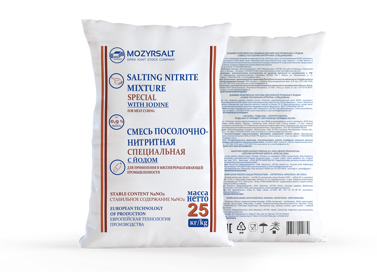 СпецификацияКомплексная пищевая добавка для мясной продукции «Смесь посолочно-нитритная «Специальная» с йодом (ПНС) произведена по технологическим регламентам ТР ТС 029/2012 и ТР ТС 021/2011 и соответствует всем требованиям ТУ РБ 400087365.001-2003.